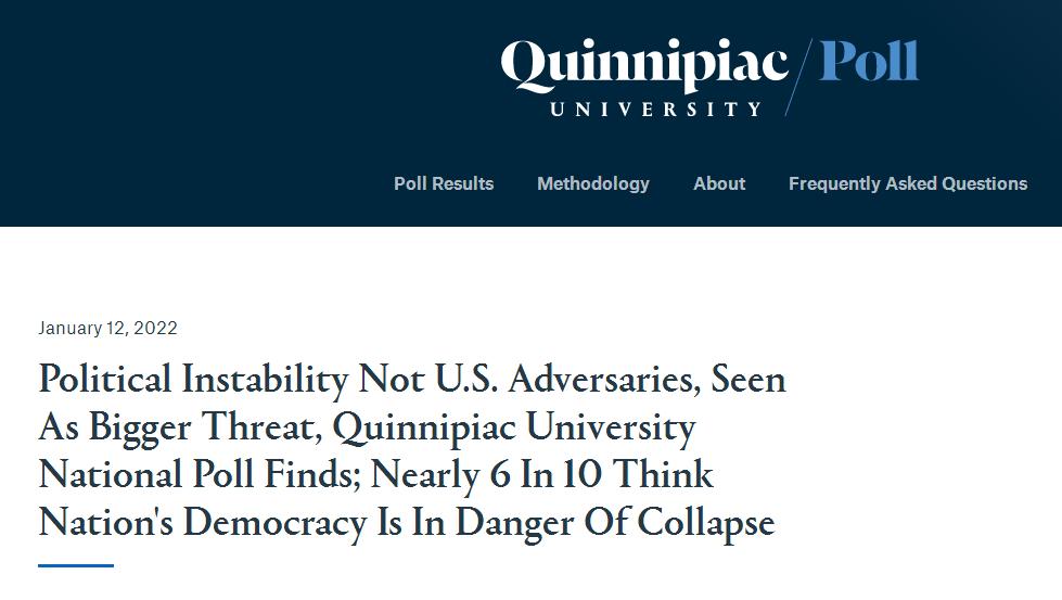 綜合英國《獨立報》和多家美媒報道,美國昆尼皮亞克大學當地時間12日公佈的民意調查結果顯示,在前總統特朗普支持者闖入美國國會大廈事件一年後,有近六成(58%)的受訪美國民眾認為,美國民主有崩潰的危險。