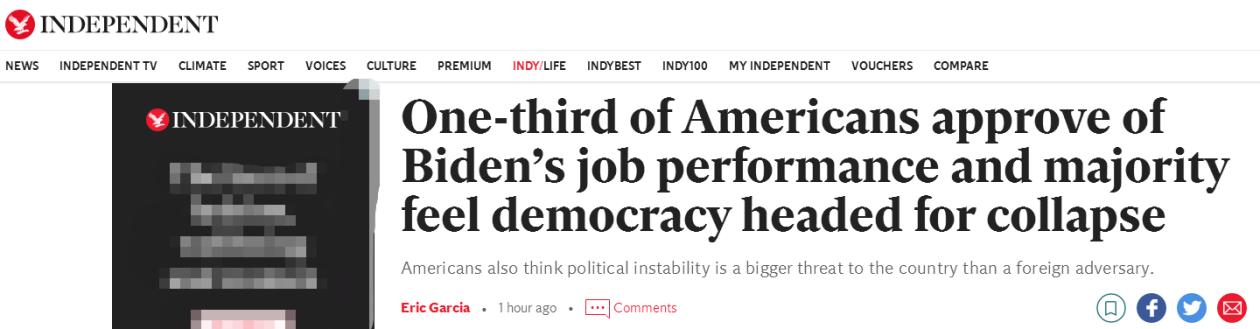 報道截圖 調查發現,76%的受訪美國民眾認為,美國政治上的不穩定性比外國威脅還要危險。58%的受訪美國民眾表示,他們認為美國民主有崩潰的危險。 而在美國國會騷亂事件過去一年之後,有53%的受訪美國民眾表示,美國很有可能或有可能再此發生此類事件。 【編輯:胡雪石】