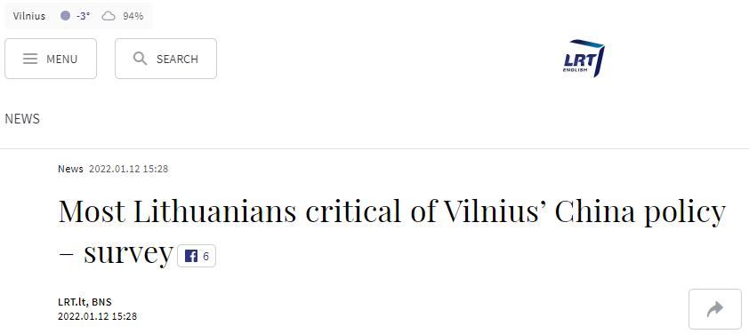 據立陶宛國家廣播電視台(LRT)、香港《南華早報》12日報道,立陶宛外交部近日委托進行的一項民調顯示,近2/3的立陶宛受訪民眾不支持該國目前的對華政策,僅13%的受訪者表示支持維爾紐斯對華強硬政策。《南華早報》稱,這增加了該國外交部的壓力。不過,據立陶宛國家廣播電視台報道,對於這份民調結果,該國那位高調“反華”的外長蘭茨貝爾吉斯堅稱,其政府的對華政策“始終如一”。