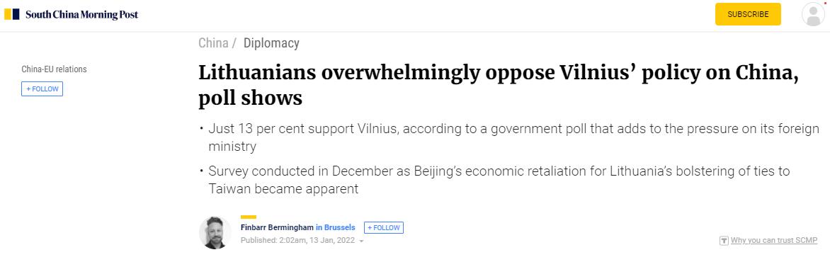 香港《南華早報》報道截圖 報道介紹,立陶宛這份民調於2021年12月10日至18日進行,詢問問題包括該國民眾如何看待當前立陶宛對華政策。周二(1月11日)公佈的結果顯示,僅13%的受訪者表示支持,有60%的人持否定態度。 報道稱,調查結果還顯示,總體而言,立陶宛民眾對該國政府外交政策的信任度僅為30%,有47%的人表示“不信任”。 對於這份民調,報道稱,該國外長蘭茨貝爾吉斯批評了調查問題的措辭,並堅稱立陶宛的對華政策“始終如一”:“實際上,立陶宛從未改變過對華政策。中國已決定對立陶宛和歐盟採取未經宣佈的、極有可能非法的措施,”蘭茨貝爾吉斯周三(12日)狡辯說,“事實就是這樣。” 蘭茨貝爾吉斯聲稱這份民意調查中的一些問題措辭“不夠準確”:“我可能會問立陶宛是否應該支持、同意台灣人民被稱為‘台灣人’的願望,而不是詢問立陶宛對中國的政策。” 事實究竟如何?據報道,近來不斷挑釁中國的立陶宛政府、及其外長蘭茨貝爾吉斯,目前正面臨愈來愈大的壓力與質疑。立陶宛總統瑙塞達本月4日就曾批評該國政府決定讓台當局以“台灣”名義開設“駐立陶宛代表處”是一個“錯誤”,他本人沒有就此事“得到充分協調”,引起巨大關注。 此後,立陶宛影子內閣發表聲明,表示希望立中關係正常化,承認台灣是中國領土不可分割的一部分,希立政府糾正錯誤,將“台灣駐立代表處”改名為“台北代表處”。對此,中國外交部發言人汪文斌11日表示,我注意到有關報道。中立關係出現問題的是非曲直十分清楚。立陶宛政府背信棄義,罔顧中立關係大局,罔顧立陶宛國家和人民的利益,遭到國內外普遍質疑和反對。我們敦促立政府糾正錯誤,不要充當“台獨”和反華勢力的棋子,作出符合自身利益和國際關係準則的選擇,回到堅持一個中國原則的正確軌道上來。 【編輯:胡雪石】