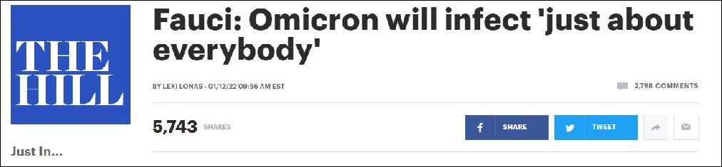 福奇:奧密克戎毒株在美國將感染“幾乎每一個人”“奧密克戎將以其異乎尋常、前所未有的傳播效率,最終感染幾乎每一個人(find just about everybody)。” 當地時間1月11日,美國頂級傳染病學專家、白宮首席醫療顧問安東尼·福奇在接受美國智庫採訪時,再次重申奧密克戎毒株的危險性,稱無論是否接種疫苗都可能感染該毒株,未接種者可能還會出現重癥、死亡情況,這將對美國衛生系統帶來挑戰。