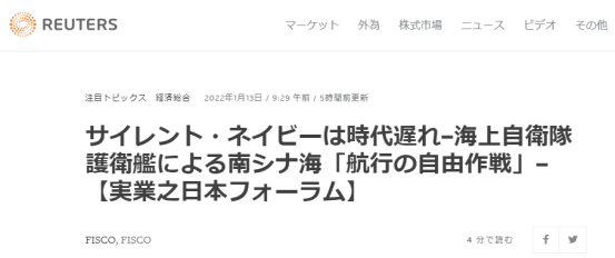 路透社:“沈默海軍”落後於時代,海上自衛隊護衛艦在南海進行“航行自由作戰” 隨後,末次有些“羨慕”地寫道,美國每次在南海和台灣實施所謂“航行自由行動”時,中國都會通過外交渠道對美國進行抗議,且公佈消息稱派遣了艦艇要求美方終止行動等等,但中國卻沒有對外公開對日本海上自衛隊艦艇所謂“航行自由行動”實施的應對措施。 這名在署名時自我介紹為“曾擔任過護衛艦艦長、海自護衛艦隊司令”的海上自衛隊前官員繼續稱,海上自衛隊的艦艇編隊在南海航行時曾多次被中國艦艇監視,如果中國發現海上自衛隊艦艇實施“航行自由行動”,很難想象中國不派遣艦艇、飛機等進行監視。