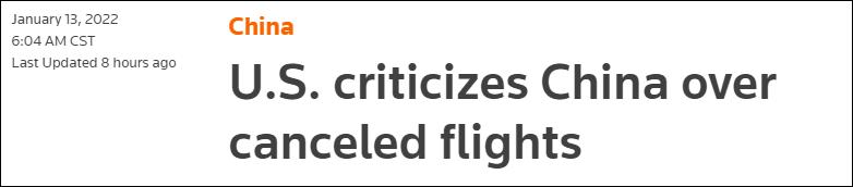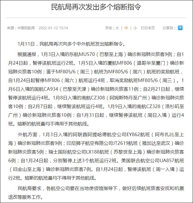 路透社報道截圖 據民航局網站1月12日消息,1月11日,民航局向多個中外航班發出熔斷指令。根據該指令,未來幾周內,6個美國至中國的航班將被暫停。路透社稱,今年被取消的中美航班已有70架次。 中國民航局網站顯示,美國聯合航空公司UA857航班(舊金山至上海)確診新冠肺炎旅客7例,自1月24日起,暫停該航班(周一入境)運行2班。1月9日入境的南航CZ328(洛杉磯至廣州)確診新冠肺炎旅客10例;自1月31日起,繼續暫停該航班(周日入境)運行4班。此外,因航班上出現陽性病例,民航局也暫停了法國、加拿大的6趟航班。