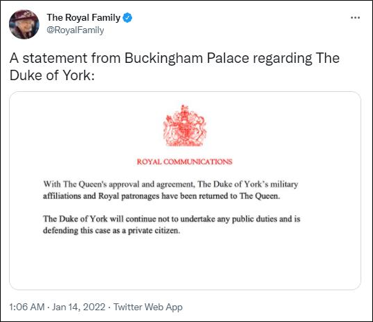 英國王室聲明截圖 美國女子弗吉尼亞·朱弗雷(Virginia Giuffre)指控安德魯王子在2001年性侵當時未滿18歲的她,並於去年提出民事訴訟。安德魯一方要求撤銷訴訟,但美國紐約地方法官卡普蘭近日駁回安德魯王子的申請,這意味著安德魯王子若未與朱弗雷達成和解協議,可能將在今年9月面對聆訊。