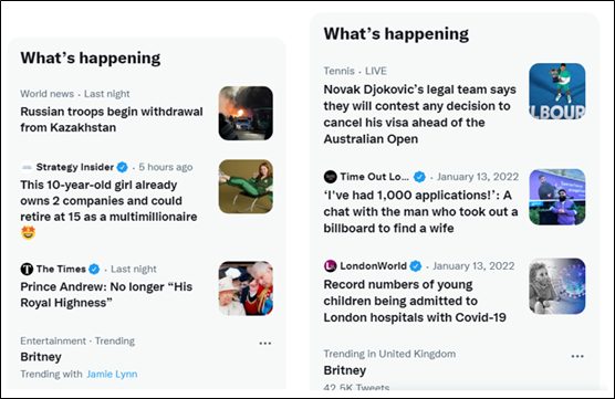 推特熱搜的美國榜單(左)與英國榜單(右)(環球網) 值得一提的是,安德魯王子的有關新聞在美國等多個地區登上了當地的推特熱搜榜,但截至發稿前,在英國地區的推特熱榜中卻看不到這一消息。# 【編輯:李彥洲】