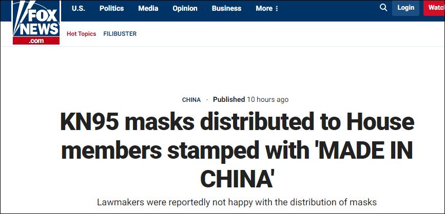 福克斯新聞報道截圖 值得一提的是,KN95口罩不僅絕大多數是“中國制造”,而且還是“中國標準”。疫情暴發初期,美國一度拒絕批準KN95口罩進口,但後來又緊急授權大量中企KN95口罩。 “435名美國眾議員戴著印有‘中國制造’的口罩” 福克斯新聞白宮記者海因里希(Jacqui Heinrich)13日在推特表示,鑒於奧密克戎變異毒株的傳播,國會主治醫生最近要求將眾議院人員佩戴的口罩升級為N95或KN95。不過,主治醫生辦公室提供給議員的KN95口罩,都是“中國制造”。 據海因里希推特發佈的照片,這些口罩正面除了印有品牌、KN95字樣外,還有醒目的“MADE IN CHINA”。 海因里希說:“一位議員告訴我,美國眾議院有435名戴著印有'中國制造'口罩的議員。” “有些(眾議院)成員不高興了。”她寫道。