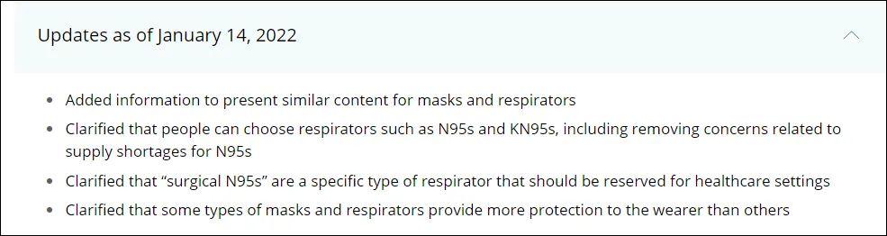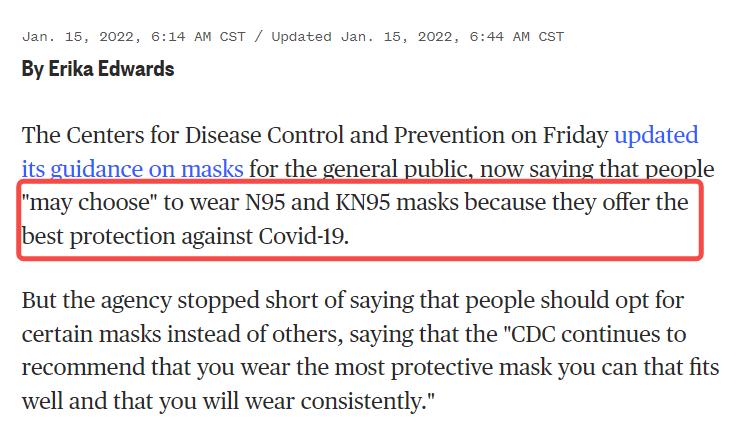 CDC 1月14日更新口罩指南 作為此次更新的總結,美國CDC也寫道,本次是“明確了大家可以選擇類似N95或KN95型號的口罩”。諸如NBC等美國媒體,已經解讀成“N95和KN95提供最好保護”。不過美國疾控中心也提醒民眾,應該將標記為“外科N95”的口罩留給醫護人員使用。