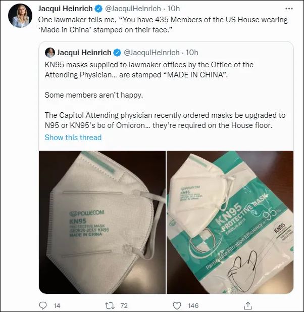 美國眾議員獲發中國制造的KN95口罩 圖源:twitter 值得一提的是,2020年新冠疫情暴發初期,美國曾一度拒絕批準進口中國KN95口罩,被美國媒體質疑背後有“政治因素”。到了當年4月中旬,已有20余家生產KN95口罩的中國企業獲得美方緊急授權。 據外交部公布的數據,2020年3月1日至2021年2月28日,中國向美國出口口罩約438.5億只,外科手套約11.9億雙,防護服約9.5億套,護目鏡約5403萬副,呼吸機17585台。 另據美國約翰斯·霍普金斯大學統計數據,截至北京時間2022年1月15日6時21分,美國新冠肺炎累計確診病例達到64671933例,累計死亡病例達到848812例。在過去約24小時裏,美國新增確診病例749272例,新增死亡病例2663例。 【編輯:石欢欢】