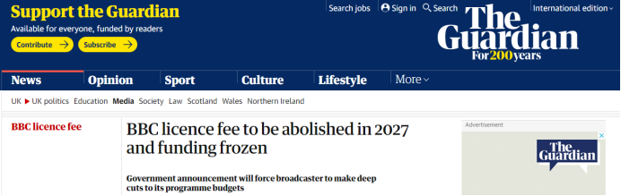 (英國《衛報》報道截圖) 報道稱,按照觀看者支付訂閱許可費的模式,BBC一直是英國政壇討論的一個話題。約翰遜政府最近曾表示,這種模式需要改革。 關於英國政府此舉原因,報道提到,幫助該國消費者緩解日益增長的生活成本是其目的之一。預計到今年4月份,該國通脹率將達30年來最高水平6%甚至更高。 路透社表示,這將對BBC的財務資金現狀造成“重大打擊”,因為這家老牌媒體正試圖與私人資助的新聞機構、其他由消費者訂閱的娛樂流媒體服務(如Netflix)進行競爭。