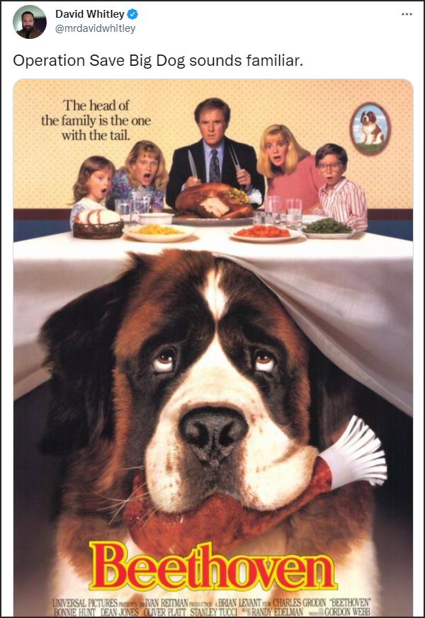赫芬頓郵報報道截圖 這個頗具喜感的行動代號在社交媒體上引發了不少吐槽。一名自由記者掏出喜劇電影《無敵當家》(Beethoven)的海報稱,“拯救大狗行動聽起來很耳熟……”