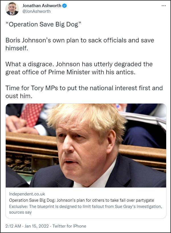 一名工黨議員發推特批判稱,約翰遜打算陷害政府官員以保全自身,這“太丟人了”,“約翰遜給首相這個職位蒙羞。”