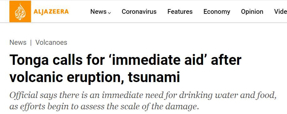 衛星捕捉到海底火山噴發的瞬間 據半島電視台17日報道,湯加議會議長法卡法努阿在社交媒體發布聲明稱:“(湯加的)通訊仍然中斷,此次災難對民眾生命和財產造成的全面損害目前還不清楚。我們所知道的是,湯加需要立即得到援助,來為公民提供新鮮的飲用水和食物。” 當地時間17日,澳大利亞和新西蘭已派出偵察機,對湯加的損失進行評估,並表示正在與美國、法國和其他國家就人道主義救援進行協調。 【編輯:俞丹鳳】