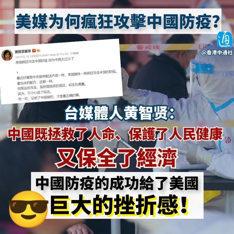 香港新聞網1月18日電 自己抗疫一團糟,還跳出來污衊中國?近日,面對美國單日新增確診病例破百萬的“慘績”,一些反華美媒視之不見,反倒將槍口對準了中國的防疫政策。對此,台灣媒體人黃智賢分析稱,“這是因為中國防疫的成功給了美國巨大的挫折感!” 黃智賢昨日(17日)在社交媒體發文,反駁美媒近期對中國防疫的無理攻擊!