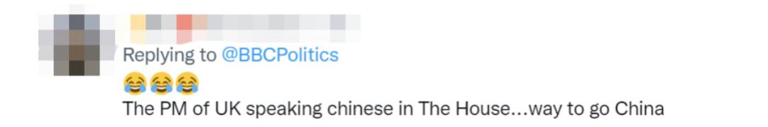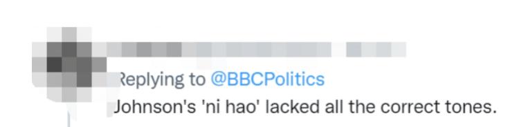 約翰遜近日深陷“派對門”醜聞。據英國媒體此前爆料,在整個新冠疫情期間,英國首相府被曝每周五都要開派對,倫敦“封城”和菲利普親王葬禮期間也概莫能外。作為首相,約翰遜不僅屢次三番參加,還鼓勵員工參加聚會“釋放壓力”。 盡管約翰遜本人已經就此道歉,但“派對門”還在發酵,一時間民怨沸騰,首相位置可能朝不保夕。最近一項民調顯示,保守黨支持率已落後主要反對黨工黨10%,創歷史新低,約翰遜個人支持率也跌至冰點。 上述對話就是在此背景下展開。不止是埃德·戴維,根據“今日俄羅斯”(RT)報道,約翰遜當天在議會還遭到前盟友大衛·戴維斯的嚴厲批評,戴維斯也要求約翰遜為自己的行為“承擔責任”並辭職。 而在BBC將這段視頻上傳至推特後,對於約翰遜為何突然說中文,許多外國網民留言表示不解:↓