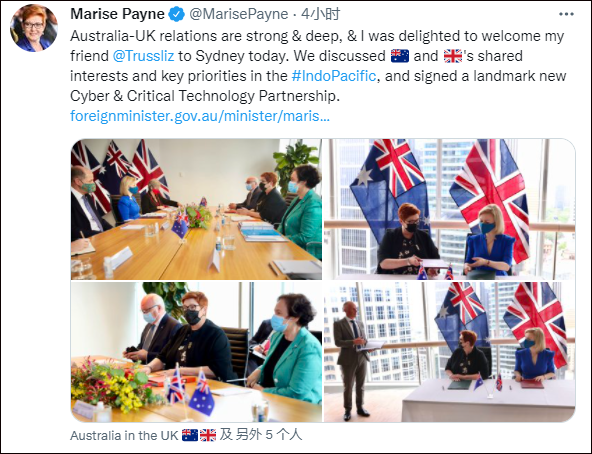 澳外長推文截圖 澳英會談,卻強扯中國 據澳英兩國官方網站消息,當地時間21日,兩國外長和防長將於悉尼舉行本年度的澳英部長級“2+2”磋商(AUKMIN)。英國外相特拉斯提前(19日)抵澳開始訪問行程,並於20日與澳外長佩恩舉行雙邊會談。 在會談中,雙方同意建立、深化網絡和關鍵技術合作夥伴關系,聯手鼓勵在印太地區進行“清潔、可靠和透明的”基礎設施投資。目前,澳英已就新的“戰略基礎設施與發展對話”達成一致,表示這將深化澳英在印太地區基礎設施投資方面的合作。 澳外長佩恩在聲明中稱,這將有助於塑造“積極的技術環境並維護開放、自由、和平和安全的互聯網環境”,以及利用技術“來維護和保護自由民主價值觀”。據佩恩描述,澳英兩國將通過“提高網絡空間中敵對國家活動的成本”,來增強威懾力。 英國外相特拉斯則表示:“英國和澳大利亞是天然的合作夥伴,我們決心通過融資和提供可靠、誠實的清潔基礎設施來發揮積極主動的作用。英國致力於建立‘自由網絡’,這意味著通過支持印太地區國家解決其發展需求來捍衛民主。” 澳英官方聲明中並未指明所謂的“敵對國家”。但據路透社報道,澳防長達頓當天聲稱,兩國將聯合“反擊”來自中、俄、伊朗的“網絡攻擊”。 達頓說道,21日的澳英部長級“2+2”磋商(AUKMIN)將重點關註網絡安全問題,因為“澳英都經常受到俄羅斯、中國、伊朗等國的網絡襲擊”,他們會“反擊”。他還說,磋商還將繼續討論深化“澳美英三遍和全夥伴關系”(AUKUS)以及相關的核潛艇問題。