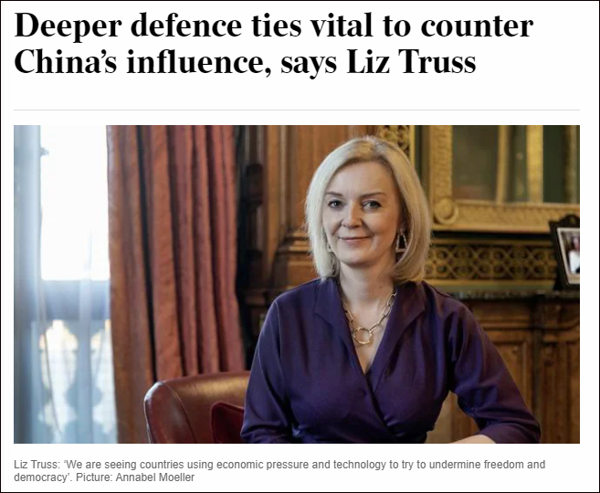 英外相訪澳,高喊“中國侵略”在約翰遜政府面臨執政危機之際,英外相和防相決定出訪澳大利亞鞏固聯盟關系。英國外相特拉斯19日抵達澳大利亞開始訪問行程,此後雙方外長、防長將於21日舉行澳英部長級磋商。 據特拉斯描述,此行是為了加強澳英在投資和網絡安全領域的合作。但澳防長達頓20日卻大談中國,揚言兩國將聯合“反擊”來自中、俄、伊朗的“網絡攻擊”。 19日,特拉斯接受澳媒專訪時更加不加掩飾,將矛頭直指中國。她聲稱,當今世界的“侵略性正在增加”,其中,中國對立陶宛和澳大利亞的“經濟脅迫”行為有所增加。特拉斯宣稱,建立更深層次的防務關系對於對抗中國的影響力至關重要,英國正就此發出自己的聲音。