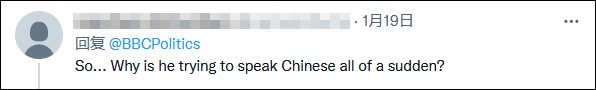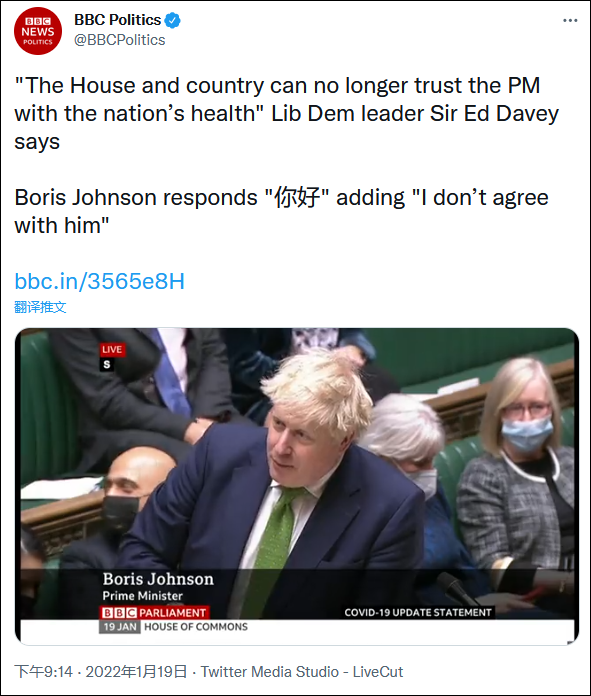 戴維 視頻截圖 接著,約翰遜表示不同意埃德·戴維關於自己應該辭職的觀點。他說,“我想要繼續當首相,並將以民眾為先,這屆政府是帶著團結全國的使命被選舉出來的,這就是我們將要做的”。 而在BBC將這段視頻上傳至推特後,對於約翰遜為何突然說中文,許多外國網民留言表示不解: “所以…他為什麼突然試著說中文?”