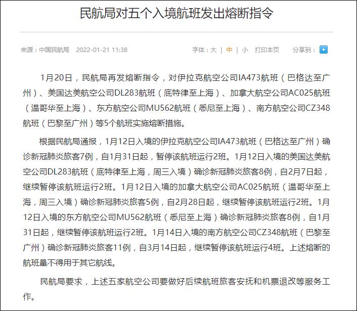 與此同時,美國交通運輸部威脅稱,如果中國修改政策,“為美國航空公司帶來必要的改善”,它就重新審視自己的行動。同時聲稱,如果中國取消更多航班,“我們保留採取額外行動的權利”。 此前,奧密克戎在全球引發大規模感染潮,入境航班病例也不斷上升,觸發民航局熔斷指令。自1月4日起,中國民航局多次發佈熔斷指令,暫停美國、法國、加拿大等多個國家的入境航班,其中包括44班次美國赴華航班,涉及美聯航、美航、達美三家航空公司。 路透社稱,疫情之前,中美之間航班約為每周100多架班次,疫情期間降至每周約20班。 據民航局網站顯示,民航局的熔斷指令早在2021年4月28日便已發佈,自2021年5月1日開始實施,一直沿用至今。入境航班是否取消,與航班入境後7天內統計的境外確診輸入病例直接掛鉤。入境航班確診人數達到5例,將引發熔斷措施。具體如下:輸入病例5-9例,可從以下兩種限制運行的方式中自主選擇: (1)航班熔斷措施:自航班入境的第四周起,暫停該航班運行2周,並取消獎勵航班; (2)控制客座率運行措施:自航班入境的第四周起,限制該航班以不高於40%的客座率運行4周,並取消獎勵航班。 輸入病例10-29例:自航班入境的第四周起暫停該航班運行4周,並取消獎勵航班。如連續兩班確診旅客人數分別達到10例的,當周立即熔斷,累計暫停運行8周。 輸入病例超過30例:當周立即熔斷,暫停該航班運行4周。 這一政策並不針對單一國家,也並不區分國內、國外航空公司。民航局1月21日發佈的熔斷指令顯示,因入境航班上發現病例,民航局宣佈暫停美國達美航空,伊拉克、加拿大航空公司,以及東方、南方航空公司等入境航班。