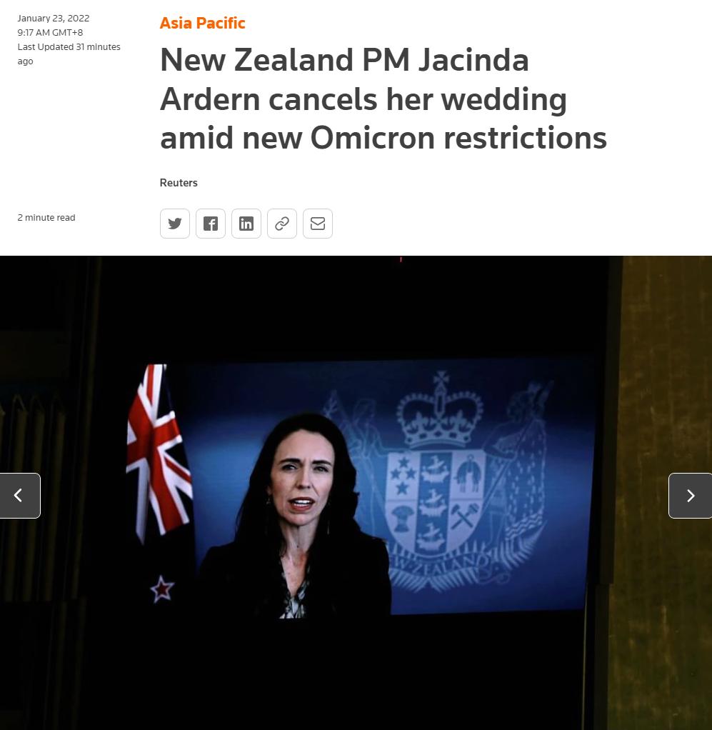 由於新西蘭實施了新的新冠疫情限制措施,新西蘭總理阿德恩1月23日宣佈取消婚禮。 據路透社報道,當地時間1月23日,新西蘭總理阿德恩向媒體表示,她已將婚禮計劃取消,原因是新西蘭開始實行新的疫情限制措施,以應對奧密克戎在新西蘭發生的社區傳播。