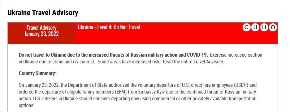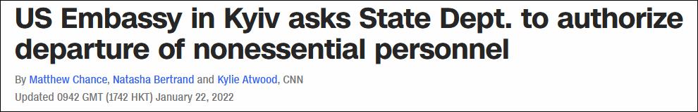 美國國務院23日發布烏克蘭旅行警告 美國務院還在公告中提醒在烏克蘭的美國公民,“俄羅斯在烏克蘭任何地方的軍事行動,都將嚴重影響美國大使館提供領事服務的能力,包括協助美國公民離開烏克蘭”,“目前在烏美國公民應該考慮使用商業或其他私人交通工具離境”。 就在這份公告發布前一天(22日),美國有線電視新聞網(CNN)援引多名消息人士的話稱,美國駐基輔大使館已要求美國國務院批準所有非必要工作人員及其家屬離開。不過當時美國駐基輔使館拒絕證實這一消息,美國國務院也表示“沒有什麽可以宣布的”。 一位接近烏克蘭政府的消息人士對CNN透露,美國已經通知烏克蘭方面,“可能最早於本周開始撤離”駐基輔大使館外交官的家屬。 該消息人士還稱,烏克蘭總統澤連斯基已經和美國國務卿布林肯交流過這件事,澤連斯基表達了不滿的態度,他告訴布林肯,如果美國採取“如此戲劇性”的手段,那將是“反應過度”。