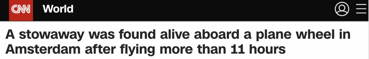 據美國有線電視新聞網(CNN)報道,荷蘭有關機構1月23日在一架從南非飛抵荷蘭的貨運飛機前輪發現一名偷渡者。令人驚訝的是,該名偷渡者在飛機輪子上趴了11個多小時後,竟還活著……