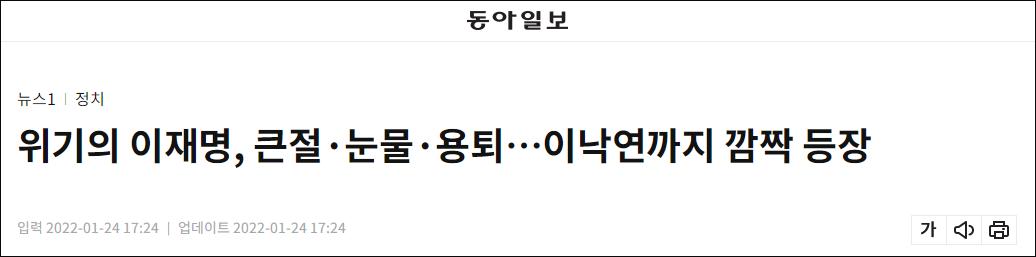 《東亞日報》報道截圖 綜合《東亞日報》、《韓國日報》、韓聯社等韓國媒體報道,韓國大選迫在眉睫,李在明的支持率維持在30%左右,不上不下。而最大在野黨國民力量黨候選人尹錫悅借助青年層的支持,呈現出上升趨勢。 韓國民調機構Realmeter24日公布的下屆總統支持率調查結果顯示,最大在野黨國民力量候選人尹錫悅的支持率為42%,較上次調查上升1.4個百分點,執政黨共同民主黨總統候選人李在明為36.8%,較前略升0.1個百分點。兩人支持率差距5.2個百分點,超出誤差範圍。在“當選可能性”問項中,尹錫悅以45.2%的支持率領先,較上周上升了3.3個百分點,李在明為43.3%,較前下滑2.9個百分點。 共同民主黨黨內開始出現“再這樣下去就會輸”的擔憂聲音。 《東亞日報》綜合分析近期韓國民調結果稱,雖然李在明和尹錫悅勢均力敵,但在野圈還存在聯合的可能性,因此形勢對執政黨共同民主黨不利。共同民主黨選舉對策委員會中有人擔心,若李在明支持率持續下降,春節後和尹錫悅的差距有可能進一步拉大。如果節日過後在野圈的候選人實現聯合,共同民主黨有可能失去勝機。 為此,李在明決定在春節前採取前往京畿道造勢的戰略。 24日,李在明在京畿道龍仁市召開記者會前,在沒有事先計劃的情況下,再次下跪行大禮,該地區30多名黨內議員也參與其中。