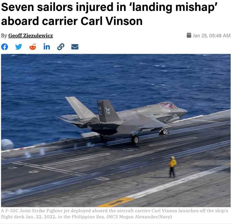 短短三個月時間內,由美軍火商研制的F-35系列戰鬥機A、B、C三大型號接連出事。先是2021年11月,英國海軍一架F-35B上演從航母上墜海的鬧劇;接著在1月初,韓國空軍又發生了F-35A機腹著陸的罕見事故;1月24日,美國海軍又傳出壞消息——F-35C在南海降落時意外撞上航母甲板,造成7人受傷。