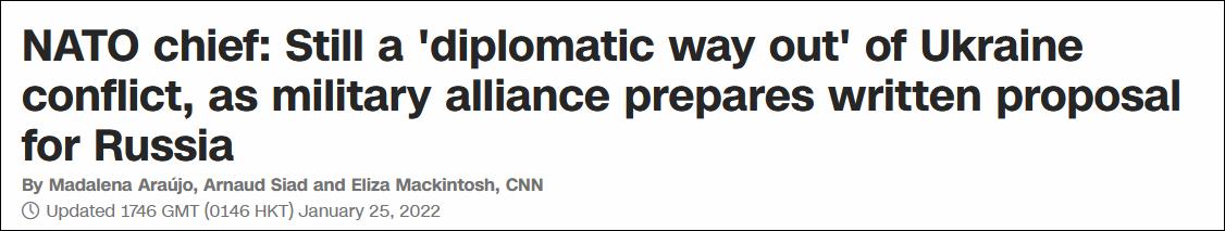 CNN報道截圖 斯托爾滕貝格說,北約將在給俄羅斯的書面提案中列出雙方討論的議題,包括“軍控、裁軍、軍事活動透明度、降低風險機制等與歐洲安全有關的問題”,并且“坐下來傾聽俄羅斯的關切”。 他表示,解決俄烏危機“仍有外交途徑”,“但這需要俄羅斯緩和緊張局勢,并準備與北約及其盟國進行有誠意的政治談判。” “北約不會向烏克蘭派遣作戰部隊(combat troops)。”斯托爾滕貝格緊接著強調,即便如此,北約仍需要確保“保衛所有盟友——特別是東歐地區盟友的準備和承諾”不會被誤解,這正是北約進一步增兵東歐地區的原因。