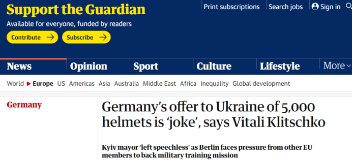 英國《衛報》報道,德國防部1月26日發佈消息,將向烏克蘭提供5000頂軍用頭盔等物資支援。不過,烏克蘭基輔市長克里琴科看起來對德國的“禮”并不滿意,他回應說:這讓我們很無語,“接下來德國將提供什麼樣的支持?枕頭嗎?”。