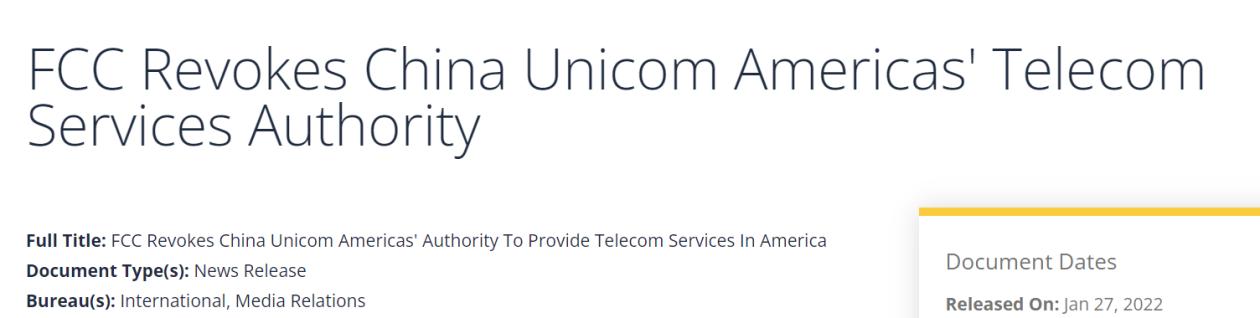 美國媒體稱,美國聯邦通信委員會(FCC)當地時間1月27日發佈一項命令,吊銷中國聯通(美洲)運營有限公司(China Unicom (Americas) Operations Limited)在美國提供州際和國際通信服務的授權,并要求該公司在命令發佈的60天內停止在美的任何國內和國際服務。