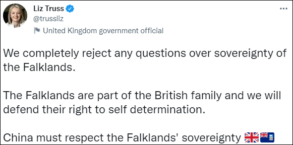 中國和阿根廷的一份聯合聲明 ,讓英國外相急了。 今年是中阿建交50周年。應中方邀請,阿根廷總統費爾南德斯2月4日出席北京冬奧會開幕式並訪華。6日,兩國發佈“關於深化中阿全面戰略夥伴關係的聯合聲明”。 聲明第四條即寫道,阿方重申堅持一個中國原則,中方重申支持阿方在馬爾維納斯群島(下稱馬島,英國稱福克蘭群島)問題上完全行使主權的要求,以及根據聯合國相關決議,盡快重啟談判以期和平解決爭端。 看到中國的最新表態,英國外交大臣伊麗莎白·特拉斯(Liz Truss)當地時間6日晚急忙發推,宣稱“完全拒絕”任何有關馬島“主權”的疑問,稱其是“英國大家庭的一員”,還跟中國談起了“尊重主權”。
