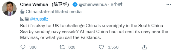 社交媒體截圖 對此,中國日報社歐盟分社社長陳衛華留言反問:“但是英國就可以派軍艦來挑戰中國在南海的主權?至少中國還沒有派海軍去馬島附近,或者你所說的福克蘭群島。”