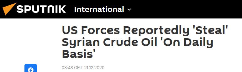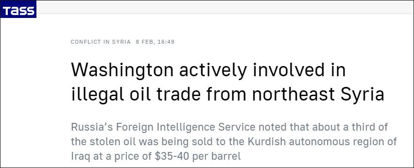 塔斯社截圖 綜合俄羅斯衛星通訊社和塔斯社2月8日消息,俄對外情報局稱,美國持續盜竊敘利亞自然資源,在敘利亞東北部被占領地區大肆開採石油,並積極參與非法石油貿易。美國在哈塞克省、拉卡省和代爾祖爾省每月的原油盜採量高達300萬桶,其中約三分之一的被盜石油通過美國中介以每桶35到40美元的價格賣到伊拉克庫爾德自治區。 俄對外情報局還稱,美國軍事人員護運輸車輛將石油運送到伊拉克庫爾德。此外,美國軍方和私營軍事公司人員還為石油生產和加工的基礎設施組織了一個“安全系統”。 美軍僅是被發現的“偷盜”行為就不止一次。 2019年10月,俄國防部發佈數張衛星圖片,顯示當年8月和9月期間,有多輛石油運輸車輛聚集在敘利亞的代爾祖爾省。俄國防部稱,這是美國將石油運出敘利亞的非法行動的一部分。 俄羅斯外交部長拉夫羅夫表示,美國開採敘利亞油田的企圖違反國際法。 2020年12月,俄羅斯衛星通訊社還曾以“據報道美軍基本‘每天’都在‘偷’敘利亞石油”為題發表文章指責美軍“偷盜”行為。
