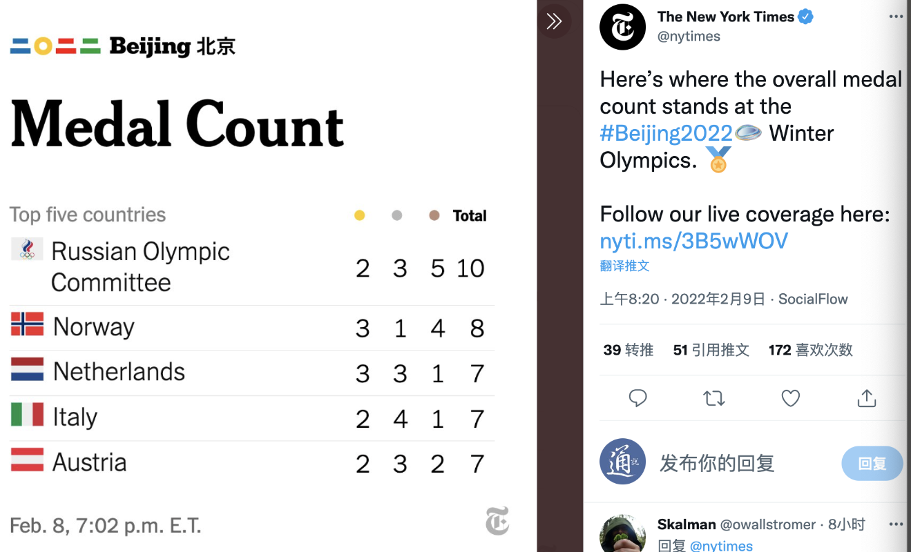 有外國網友被《紐約時報》發布的這一獎牌榜逗樂了,諷刺道:“為了把中國排除在外,《紐約時報》不得不把俄羅斯排在第一位,肯定很痛苦吧!” 也有網友揶揄:“《紐約時報》選擇獎牌排名方式的標準就是中國是否名列前茅。不幸的是,不管在什麼獎牌榜,美國都沒能進前五!” 不少網友直接在評論區貼出冬奧會官方排名,打臉《紐約時報》!根據北京冬奧會官方數據,獎牌榜排名前五的國家依次為挪威、瑞典、荷蘭、中國和德國,獎牌榜按金牌獲得數排名。 《紐約時報》“獨樹一幟”的排名方式,自然引來眾多外國網友批判! “即使官方獎牌榜根據金牌數來排名,《紐約時報》仍堅持按獎牌總數來排名,為什麼?”網友紛紛質問美媒:“嘿,中國在哪裡?我們知道中國獲得3枚金牌,為什麼要向美國人隱瞞這件事?” 有網友表示,這是“又一個《紐約時報》通過扭曲真相以符合自己敘事的證明!” 有網友直言為《紐約時報》此舉“感到羞恥”,諷刺“《紐約時報》具體和生動地展示了其作為‘中立媒體’的觀點。” 有網友則恍然大悟:“難怪美國人看了你們的報道,會對中國產生扭曲的看法!” 在東京奧運會上,《紐約時報》等美媒已採用以總獎牌數優先的獎牌計算方式。 當時中國金牌數一度領先,部分美媒乃至美國國家奧林匹克委員會卻優先計算獎牌總數,好讓美國排在中國前面。 這一做法當時在社交媒體上受到廣泛批評,澳洲新聞網(News.com)指責美國在獎牌榜上“造假”。有外媒揶揄:“很多美國報刊都找到了自己的方式來給世界各國排序”,“驚喜來了——這意味著某個國家都能排在榜首。” 《紐約時報》的操作就更令人困惑。他們一開始使用的是獎牌總數優先的獎牌榜,數小時後該榜單被刪除,又發布了以金牌優先的獎牌榜,不知是否受輿論質疑影響…… 其實無論有否獲得獎牌,每個參加奧運會的運動員都是國家的驕傲。美國對待體育比賽的心態不妨坦然一點,自信一點! 【編輯:张琦】