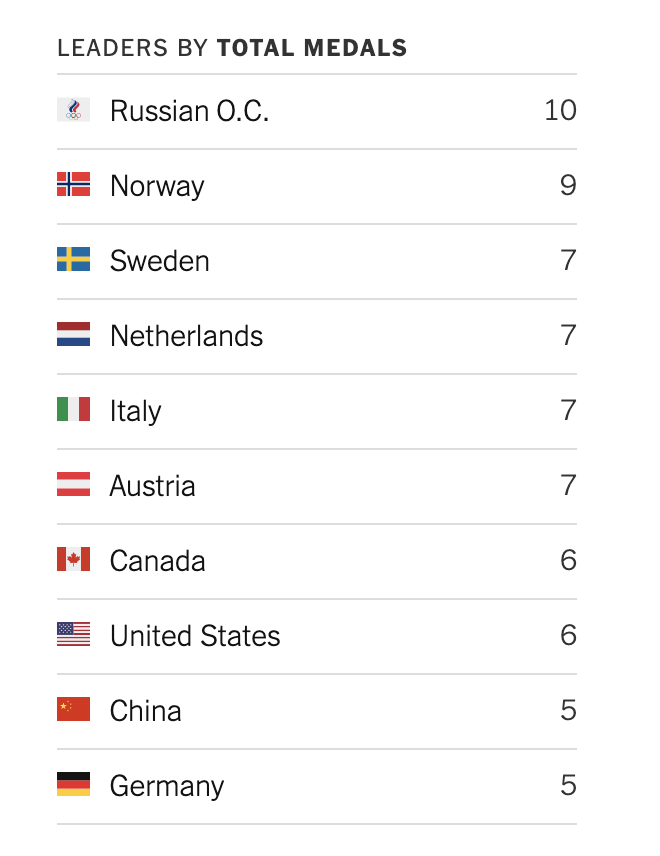 根據《紐約時報》發布的獎牌榜數據, 3枚金牌在手的中國僅排名第九,而金牌數不如中國的美國在此“創意榜單”上的排名卻高過中國! 據該獎牌榜顯示,排名第一的是獲得2枚金牌,獎牌總數為10枚的俄羅斯奧林匹克委員會。獲得4枚金牌的挪威和瑞典緊隨其後,獎牌總數分別為9枚和7枚。排名第四和第五的國家分別是荷蘭和意大利,都獲得7枚獎牌,金牌數分別為3枚和2枚。