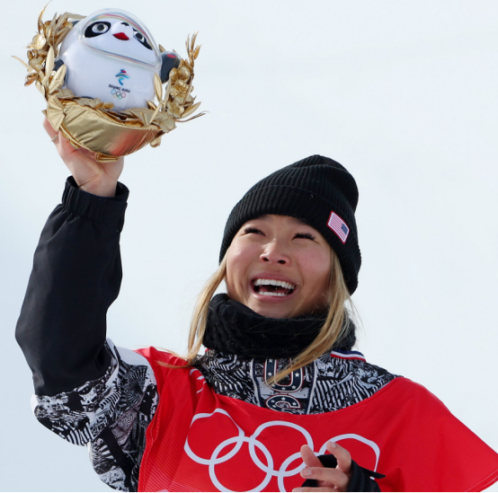 此外,在照片中,單板滑雪女子U型場地技巧項目冠軍、美國運動員克洛伊·金則高舉冰墩墩,面露笑容。
