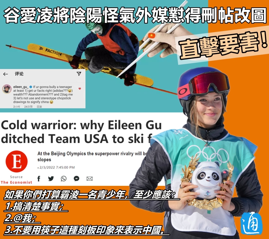 香港新聞網制圖 《經濟學人》在不久前於社交媒體發表題為《冷戰戰士:為何谷愛淩拋棄美國,轉為中國滑雪》的文章,並配上一張“內涵”滿滿的圖片——正在施展滑雪才能的谷愛淩被一雙筷子夾住。 對此,谷愛淩在其評論區硬氣回懟: 如果你們打算霸淩一名青少年,至少應該: 1.搞清楚事實; 2.@我; 3.不要用筷子這種刻板印象來表示中國。 被谷愛淩懟完之後,《經濟學人》隨即在各發稿平台修改了相關文章配圖。 此事近日被網友扒了出來,並在社交媒體上瘋傳。對於谷愛淩的霸氣回擊,網友直呼懟得漂亮、過癮:“直擊要害”、“每句都戳到政治正確的痛點上”、“全方位的戰鬥力”! 截至發稿,谷愛淩這則評論已經無法找到,有網友質疑是《經濟學人》刪除原貼以了事。# 【編輯:李雪萍】