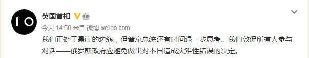 北京時間15日下午,英國首相約翰遜在其微博賬號@英國首相 用中文發文,還提到俄羅斯總統普京。