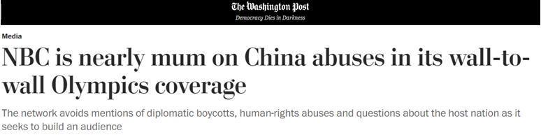 《華盛頓郵報》:NBC在其全方位的奧運報道中對中國的侵權行為幾乎保持沉默 《奧林匹克憲章》明確指出,體育運動是一項人權。中國外交部也強調,將奧運會政治化的言行不僅是對運動員人權的破壞,更是對奧林匹克精神的褻瀆,有違團結與合作的時代潮流。然而,有的美國媒體卻執意試圖將奧運會政治化。《華盛頓郵報》15日刊文,聲稱NBC向國際奧委會支付了數十億美元,以獲得奧運會在美國的獨家電視和數字版權,但它幾乎沒有從體育報道中抽身出來,去報道圍繞中國的任何“更令人不安的方面”。