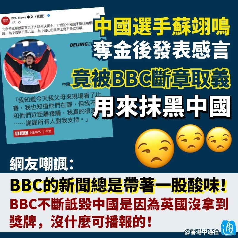 蘇翊鳴奪冠 蘇翊鳴獲獎感言中滿是對家人、教練和祖國的感激,未料卻遭英媒BBC斷章取義、暗戳戳地攻擊中國的防疫政策…… BBC中文網在報道蘇翊鳴奪金的消息時,製圖並著重強調這麼一段話:“我知道今天我父母來現場看了比賽,我也知道他們在哪,但我不能和他們近距離接觸,我真的很激動……謝謝所有人對我的支持。” BBC特意突出蘇翊鳴不能和父母“近距離接觸”,卻無視其感謝祖國的話。似乎有意引導大眾批評北京冬奧會防疫“太過嚴格,不近人情”。
