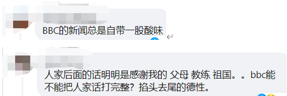 網友評論 不過,更多網友則是一眼識穿BBC妄圖給中國潑髒水的把戲! “BBC的新聞總是帶著一股酸味!” 網友們紛紛打臉BBC:“人家後面的話明明是感謝我的父母、教練、祖國,BBC能不能把人家的話寫完整?掐頭去尾的德性。”