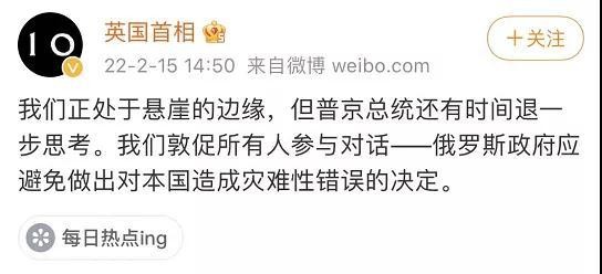 香港新聞網2月17日電 近段時間,西方媒體幾乎每天都在發表類似“俄羅斯隨時入侵烏克蘭”的聲明。不久前,部分美國媒體還宣稱,2月16日就是俄羅斯將對烏克蘭發起“大規模進攻”的日子。但沒想到16日到了,俄羅斯沒有“入侵”烏克蘭,但和西方國家在中國的社交平台微博上過招了。 2月15日下午,被認證為“英國首相鮑里斯•約翰遜”的微博賬號@英國首相在停更三個多月後,突然就烏克蘭局勢用中文喊話普京:“我們正處於懸崖的邊緣,但普京總統還有時間退一步思考。我們敦促所有人參與對話——俄羅斯政府應避免做出對本國造成災難性錯誤的決定。 ”