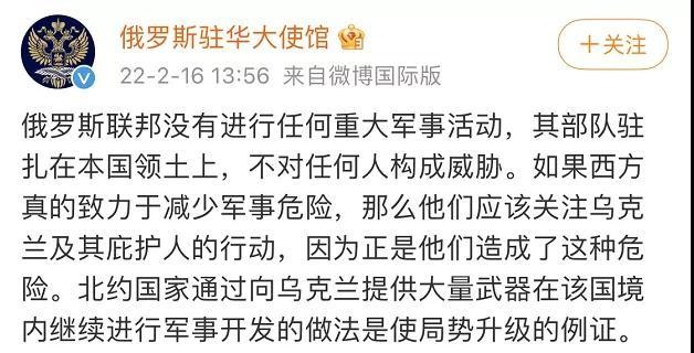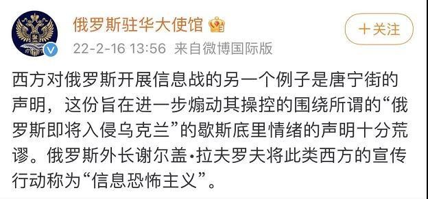 (微博截圖) 到了第二天,@俄羅斯駐華大使館還真回應了:“西方對俄羅斯開展信息戰的另一個例子是唐寧街的聲明,這份旨在進一步煽動其操控的圍繞所謂的‘俄羅斯即將入侵烏克蘭’的歇斯底里情緒的聲明十分荒謬。”“俄聯邦沒有進行任何重大軍事活動,其部隊駐扎在本國領土上,不對任何人構成威脅。”