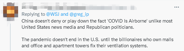《華爾街日報》配圖 此外,對於西方經常借所謂“民主”攻擊中國防疫政策,文章援引《柳葉刀》(Lancet)最近一項試圖解釋為什麼從疫情開始到去年9月一些國家的新冠感染和死亡率較低的研究。這項綜合考察了諸如人口密度、人均收入、年齡和既有條件的研究發現:“在這場疫情大流行中,我們找不到民主與抗疫表現之間的關聯”,文章的作者之一、美國對外關係委員會(Council On Foreign Relations)全球健康項目主任托馬斯·博利基(Thomas Bollyky)說。 《華爾街日報》該篇文章接下來指出,研究發現,造成抗疫效果差異的是信任。公民越信任政府,或彼此間的信任度越高,國家就越能有效地應對新冠疫情。“直觀地說,信任政府的民眾更有可能遵守社交距離、密接者追蹤、佩戴口罩和接種疫苗的規定。而在缺乏信任的地方,民眾不太可能遵守相關規定,政府也不太可能要求民眾。人與人之間的互信鼓勵民眾去做可以保護他人的事情,并相信他人也會這樣做。”文章援引世界價值觀調查(World Values Survey)顯示:中國民眾對政府的信任度很高,在美國則很低。 在《華爾街日報》之後將這篇文章發佈在社交媒體推特上後,雖然有美國網民“毫無意外”地給這家美媒“挑刺”、不滿其肯定中國,但還是不乏一些敢“說真話”的網友。 一位網友寫道:“與大多數美國媒體和共和黨政客不同,中國不否認或淡化“新冠病毒能够在空氣中傳播”這一事實。在那些擁有購物中心、辦公樓和公寓樓的億萬富翁們修復他們的通風系統之前,疫情不會在美國結束。”