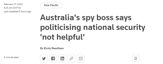(路透社報道截圖) 報道稱,伯吉斯於當地時間周三(16日)晚“罕見”接受電視采訪,發表上述意見。上周,這名澳大利亞安全情報組織負責人聲稱,有所謂外國干涉澳大選的情報,隨後又表示這一圖謀已被其“挫敗”,但他并未公佈涉及的國家或任何相關人士。然而,這一消息連日來被澳執政黨和反對黨工黨輪番拿來大做文章。澳防長達頓就藉此宣稱,中國已在澳大選中選擇支持工黨領袖阿爾巴尼斯。 對澳政壇當前藉此大做文章、攻擊對手的現象,報道表示,伯吉斯16日稱外國干預并非單獨針對某一方、某一黨,他聲稱這對澳執政黨和反對黨是“平等的”。被問及澳政客將該話題作為互相攻擊的“武器”時,伯吉斯強調了其組織的“非政治屬性”,稱澳大利亞安全情報組織不關心政治,但他明確警告,這對澳大利亞“沒有幫助”:“我會把政治問題留給政客們,但我非常清楚我必須這樣做、(而且)那對我們沒有幫助。” 報道稱,伯吉斯還表示,“不相信外國政府可以真的改變澳選舉結果”。
