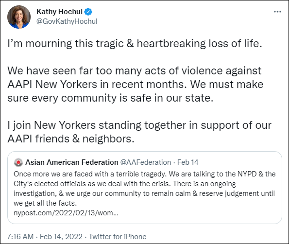 美聯社報道截圖 作為美國最大的通訊社,美聯社的這篇報道引起其他美媒關注,克洛伊的遭遇也再次進入人們視野。 當地時間2月15日,在白宮的新聞發佈會上,有記者就美聯社此篇報道內容,問詢白宮發言人普薩基(Jen Psaki)。 記者先是複述了美聯社的報道,然後提及“在拜登總統的領導下,2021年反亞裔仇恨犯罪增加了339%”這一數據,并質疑“我們似乎沒有看到白宮采取多少行動”。之後,記者提問普薩基,“總統會采取一些行動嗎?哪怕只是錄一段視頻,來提高人們的意識嗎?” 普薩基作出了回應。她先是讚揚克洛伊說出自己想法的行為“非常勇敢”,然後稱拜登已經成立了一個特別小組。普薩基繼續稱,拜登已聘請了一名高級職員作為代表,與“承受這些威脅、擔憂和恐懼”的亞裔美國人社區溝通,因為他們需要采取并將繼續采取一系列措施來解決這些問題。 需要注意的是,儘管拜登曾公開譴責了反亞裔仇恨,并宣佈了幾項應對反亞裔暴力增加的行動計劃,但暴力襲擊仍在繼續。 美國聖貝納迪諾加州大學仇恨及極端主義研究中心近日公佈的最新研究報告顯示,與2020年相比,2021年全美針對亞裔美國人社區的仇恨犯罪案件數量增加了339%,紐約、舊金山、洛杉磯等城市的仇亞犯罪案件紛紛再創新高,針對各地亞裔社區而發動的仇恨犯罪,嚴重程度前所未見。 今年1月,美籍華裔女高管被流浪漢推下紐約地鐵身亡,一時震動美國社會。而就在2月13日,一名35歲的美籍韓裔女子又被人跟蹤進入其曼哈頓公寓,并在隨後遭刺死,再次引起紐約和全美媒體關注。雖然據警方稱,華裔女子被推下地鐵事件沒有跡象表明是一起種族仇恨案件,殺害韓裔女子的凶手出於性動機”犯罪,但這兩起案件還是令紐約當地亞裔群體深感不安。 據《紐約郵報》報道,在美籍韓裔女子被殺害的數小時後,亞裔社區領袖們就在現場附近集會,要求紐約市采取行動。紐約州州長凱西·霍楚(Kathy Hochul)13日晚些時候也在推特上表示,“最近幾個月,我們看到太多針對亞太裔紐約人的暴力行為。我們必須確保我們州的每個社區都是安全的。我和紐約人站在一起,支持我們的亞太裔朋友和鄰居。”