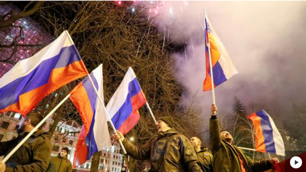 頓涅克茨街頭有民眾手持俄羅斯國旗、燃放煙花(視頻截圖) 反政府武裝控制區 頓涅茨克和盧甘斯克的親俄人士2014年接管了政府建築並宣佈這兩個州為獨立的“人民共和國”。 自從2014年,有1.4萬人在頓巴斯地區死於當地親俄民間武裝和烏克蘭軍隊之間的衝突。烏克蘭和西方指責俄羅斯在軍事上和財務上支持當地親俄民間武裝,莫斯科否認這一指控。 自稱獨立 在頓涅茨克和盧甘斯克地區的親俄民間武裝2014年奪取當地政權後,他們投票宣佈了獨立。直到現在,除了俄羅斯,沒有任何國家承認他們的獨立。# 【編輯:李彥洲】