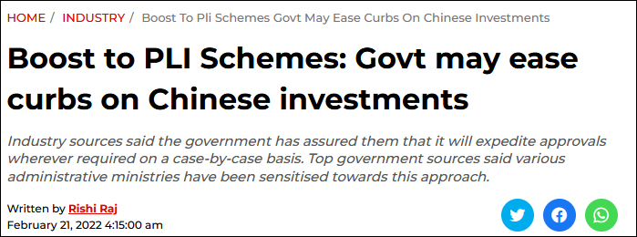 2月21日,印度《金融快報》引述官方消息人士稱,印度或根據具體情況放寬中國公司在印度關鍵領域的投資限制,但相關放鬆政策不適用於2020年被印度政府以所謂“安全”為由封禁的中國應用企業。
