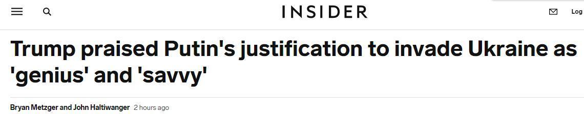 美國“商業內幕”報道截圖 2月21日,俄羅斯總統普京簽署法令,承認“頓涅茨克人民共和國”和“盧甘斯克人民共和國”。據美國“商業內幕”報道,美國前總統特朗普當地時間22日就此事發表評論,稱普京承認烏東兩地“獨立”是“天才”“精明”之舉。