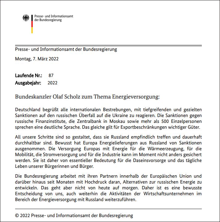 德總理朔爾茨辦公室聲明 朔爾茨辦公室關於能源供應的聲明如下: